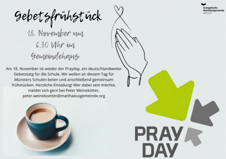 Gebetsfrühstück am Di, 18. November um 6.30 Uhr im Gemeindehaus. Herzliche Einladung!
